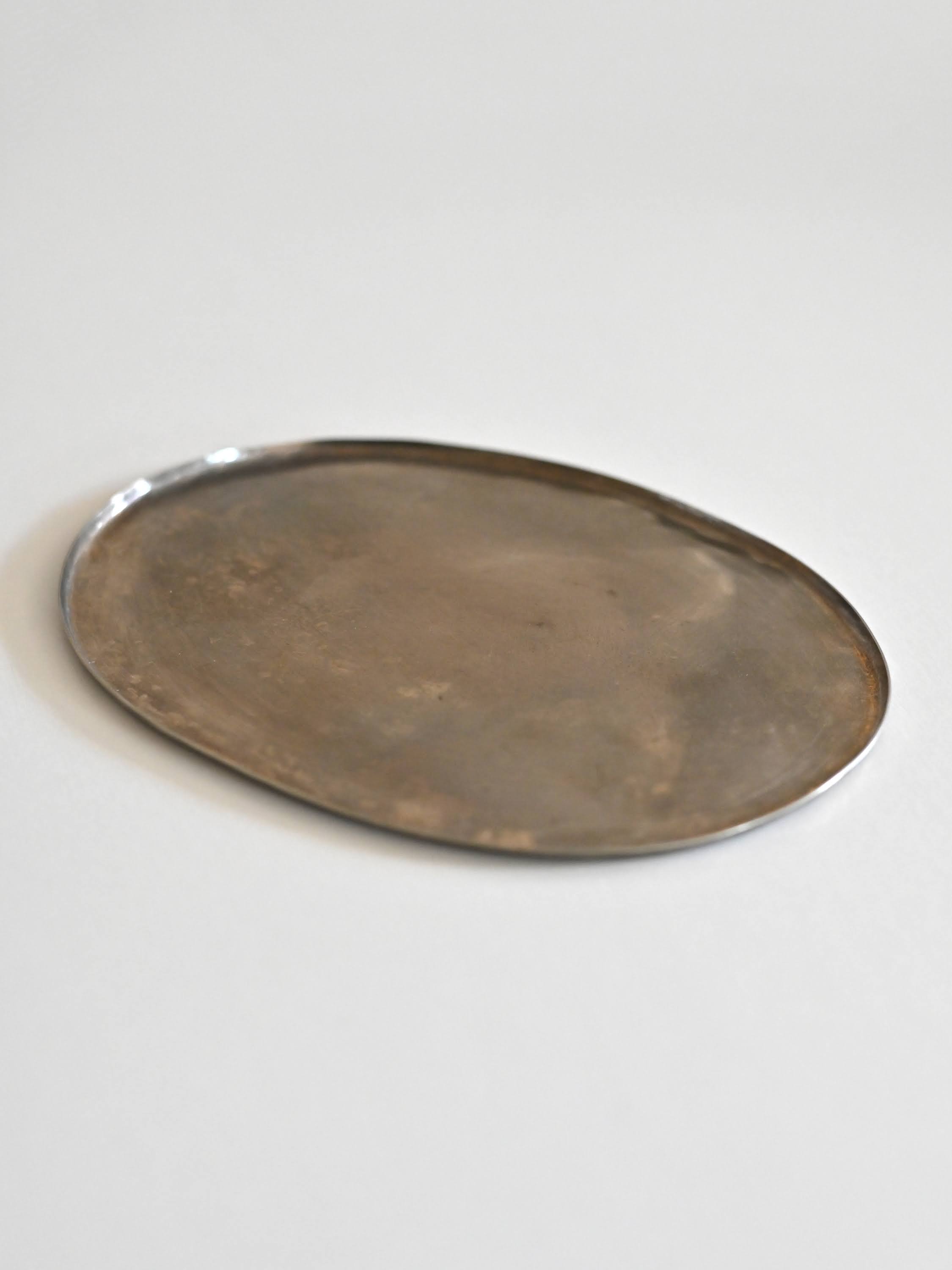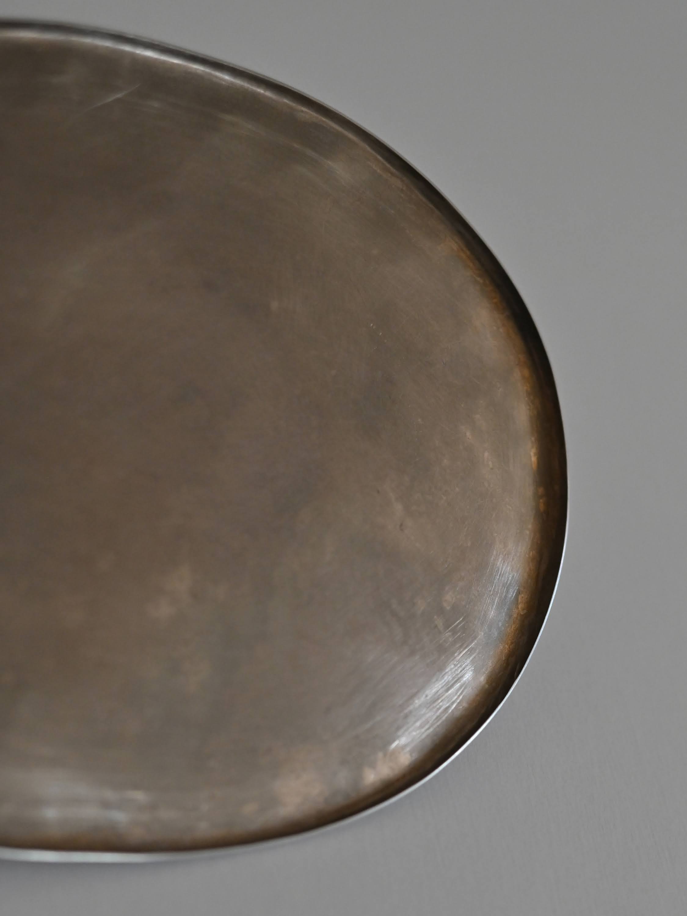 洋白は銅を主とした合金のため、ステンレスに比べると少し気遣いが必要です。最初のうちは使用後に洗って水気を拭き取ってください。使い続けるうちに表面の色味が落ち着き、水や食品の跡がつきにくくなっていきます。酢など酸味の強いものに長時間触れると変色することがあります。ピカピカな状態を保ちたい場合は、水で濡らした指に重曹をつけてやさしくこするか、スチールウールたわしで円を描くように、くるくると磨いてください。