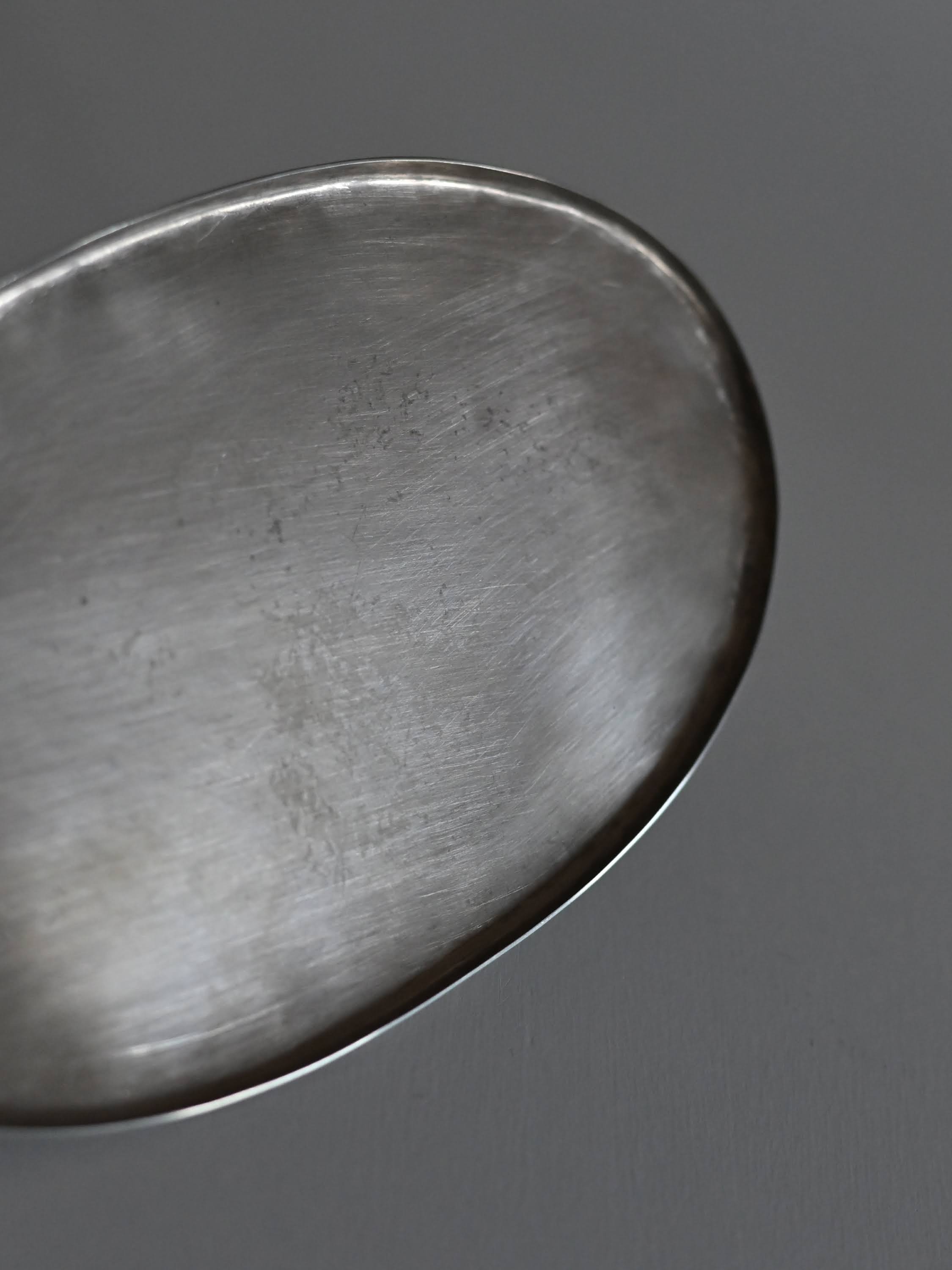 洋白は銅を主とした合金のため、ステンレスに比べると少し気遣いが必要です。最初のうちは使用後に洗って水気を拭き取ってください。使い続けるうちに表面の色味が落ち着き、水や食品の跡がつきにくくなっていきます。酢など酸味の強いものに長時間触れると変色することがあります。ピカピカな状態を保ちたい場合は、水で濡らした指に重曹をつけてやさしくこするか、スチールウールたわしで円を描くように、くるくると磨いてください。