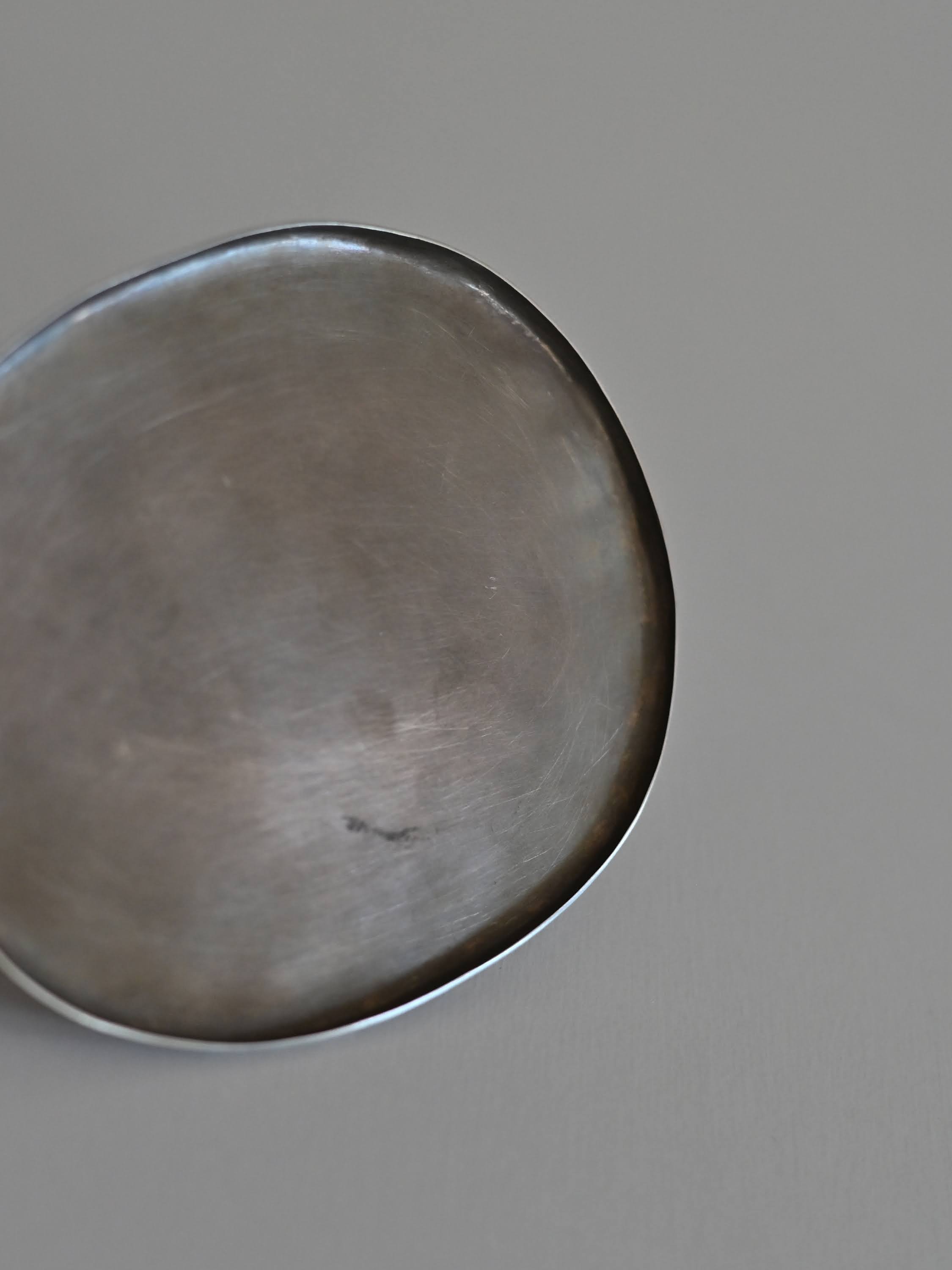 洋白は銅を主とした合金のため、ステンレスに比べると少し気遣いが必要です。最初のうちは使用後に洗って水気を拭き取ってください。使い続けるうちに表面の色味が落ち着き、水や食品の跡がつきにくくなっていきます。酢など酸味の強いものに長時間触れると変色することがあります。ピカピカな状態を保ちたい場合は、水で濡らした指に重曹をつけてやさしくこするか、スチールウールたわしで円を描くように、くるくると磨いてください。