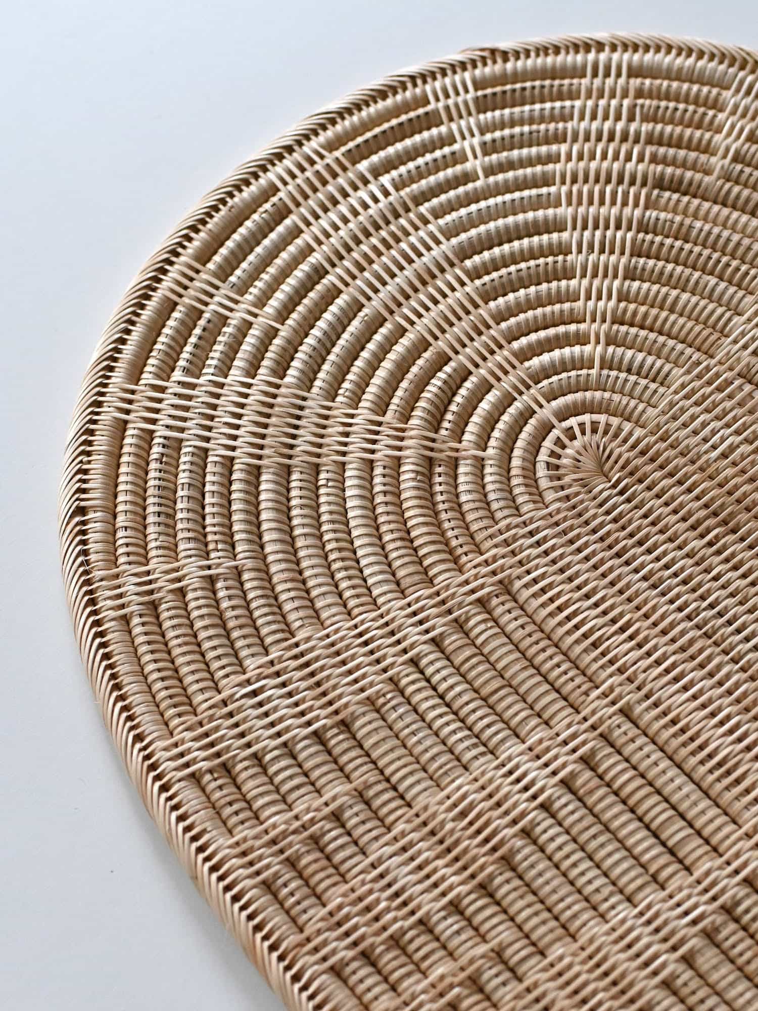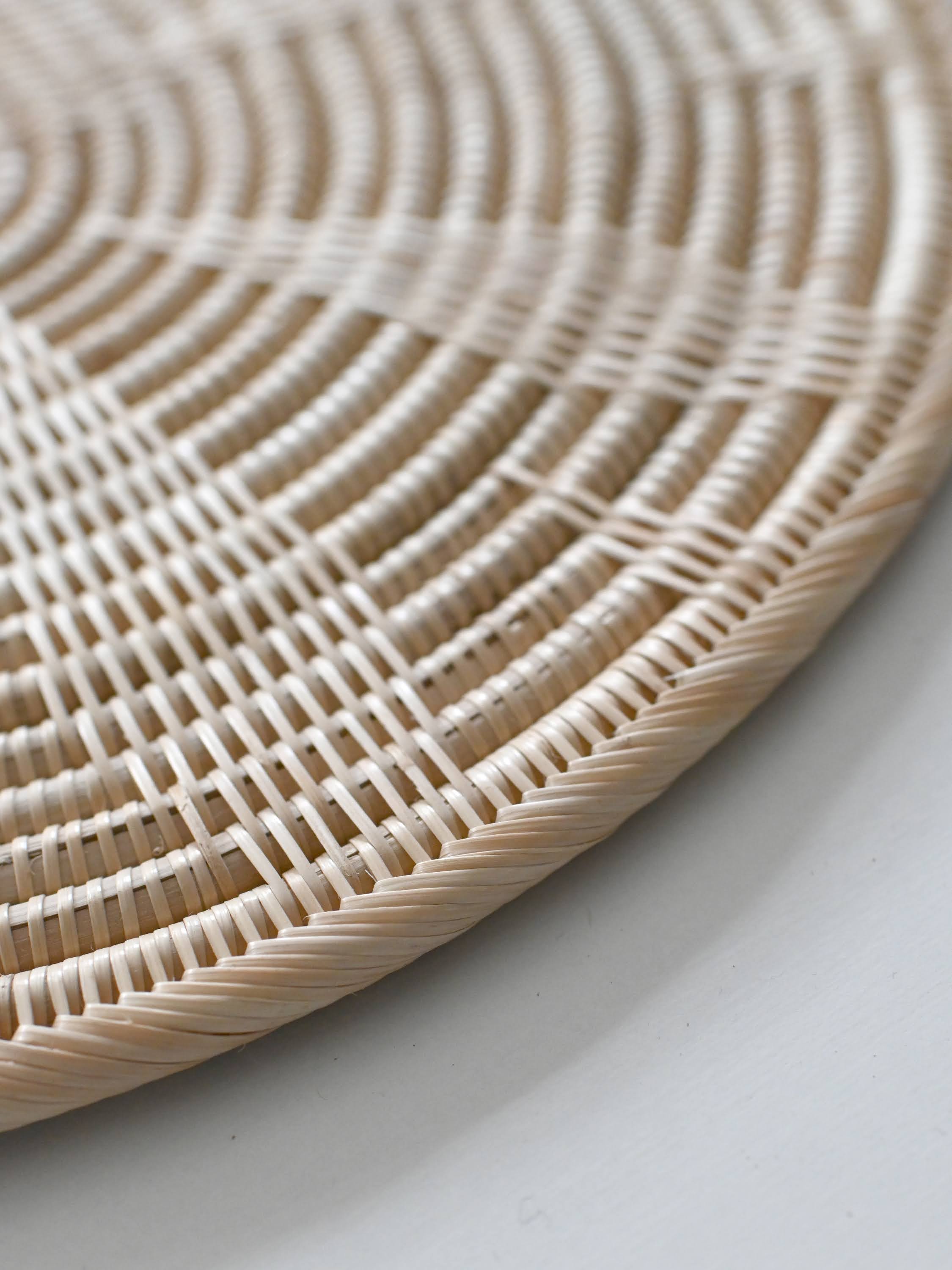 細やかな編み目が美しいラタン(籐)製品は、カンボジアのアンコールワットを抱く都市、シェムリアップ州郊外の自然豊かな村で、ひとつひとつ丁寧に手編みされたものです。この繊細な手工芸の技術は、各家々で代々受け継がれてきたそうです。カンボジアで古くから日用品などに用いられてきた、ルピア種というしなやかで丈夫なラタンの一種で作られています。普段のお手入れではブラシで編み目に沿って掃いたり、乾いた布で拭いてください。水洗いをしていただけますが、極端な湿気はカビなどの原因になりますので、水洗い後はすぐに水気を拭き取り、よく乾燥させてください。
