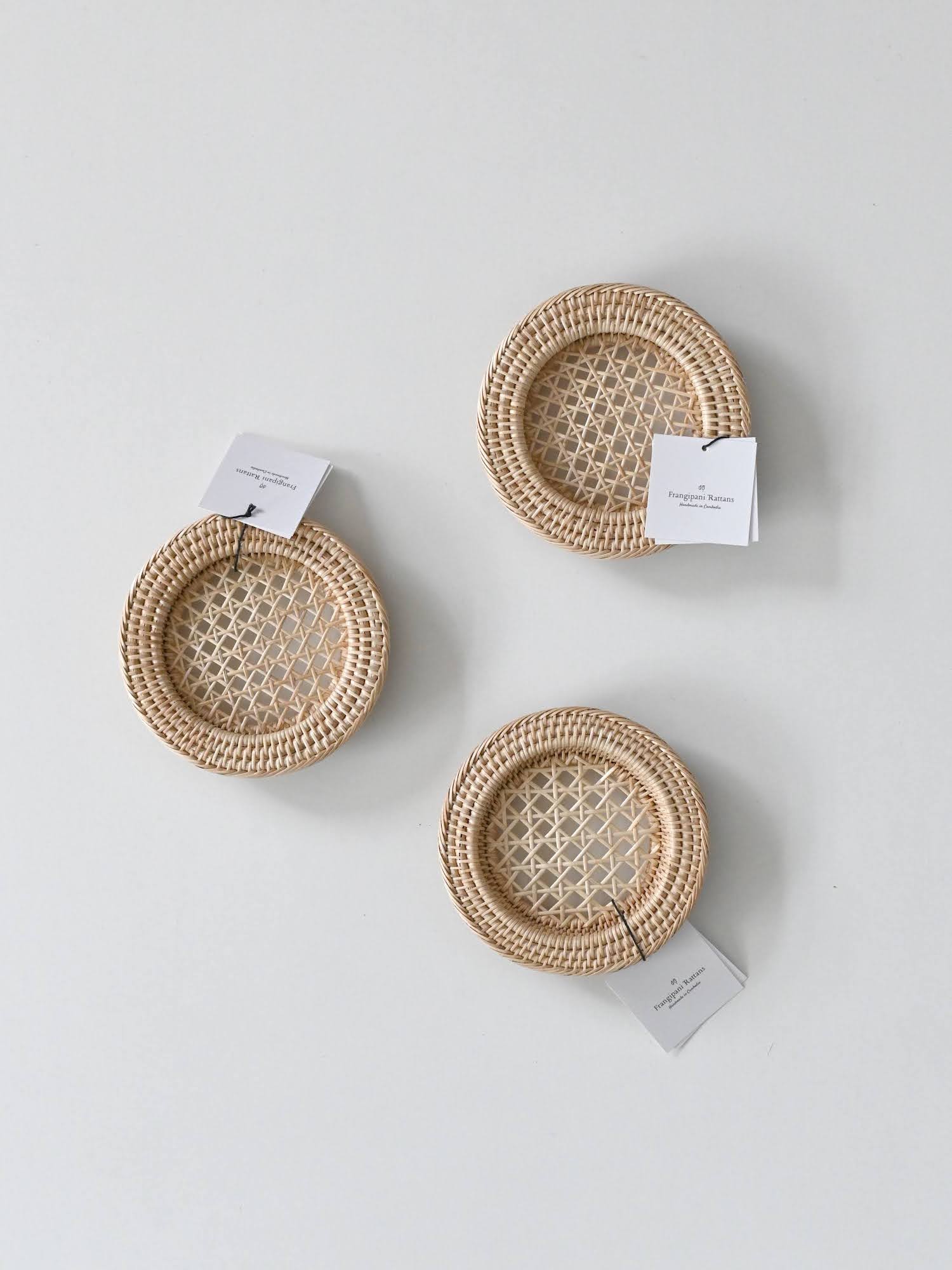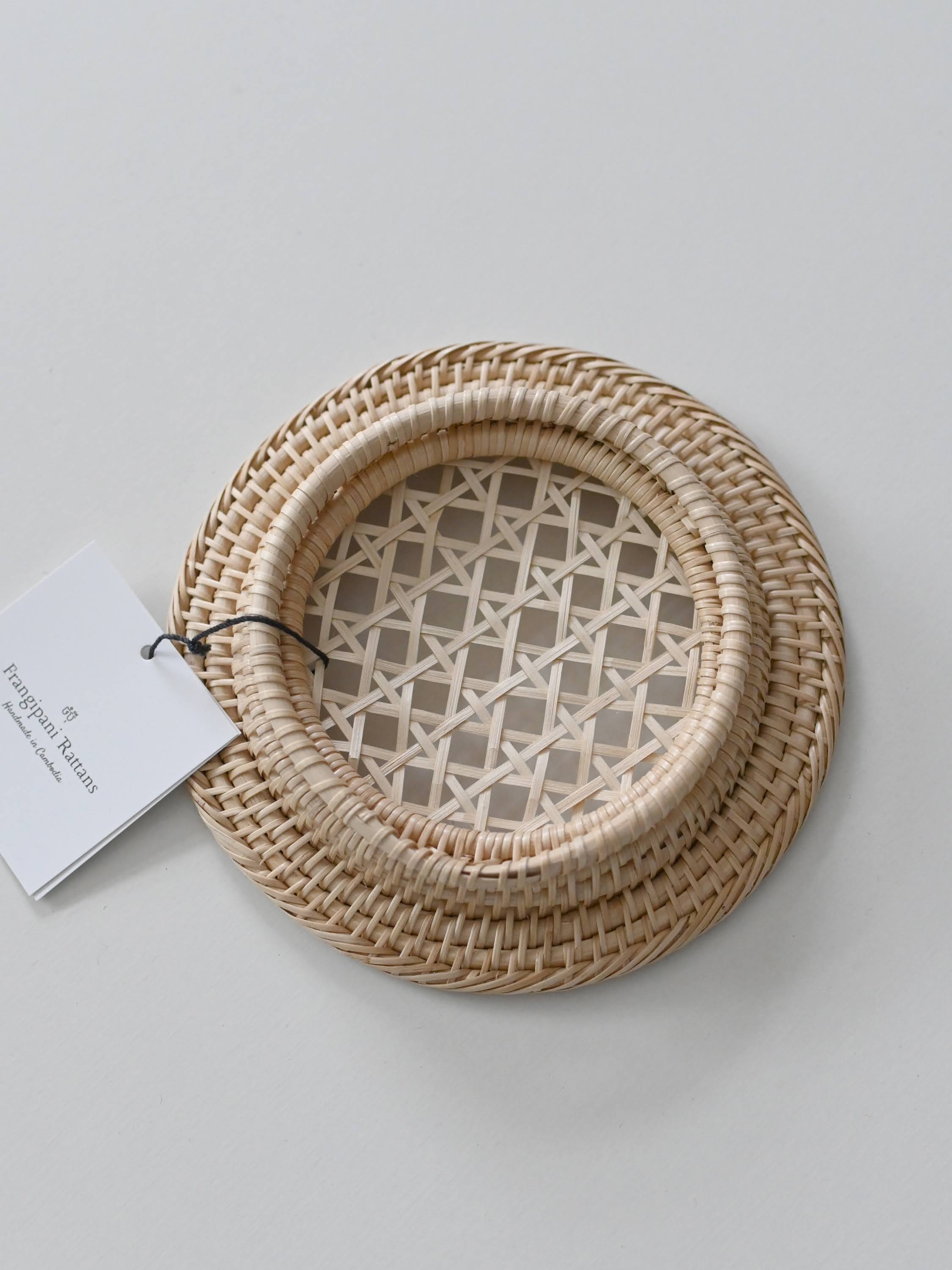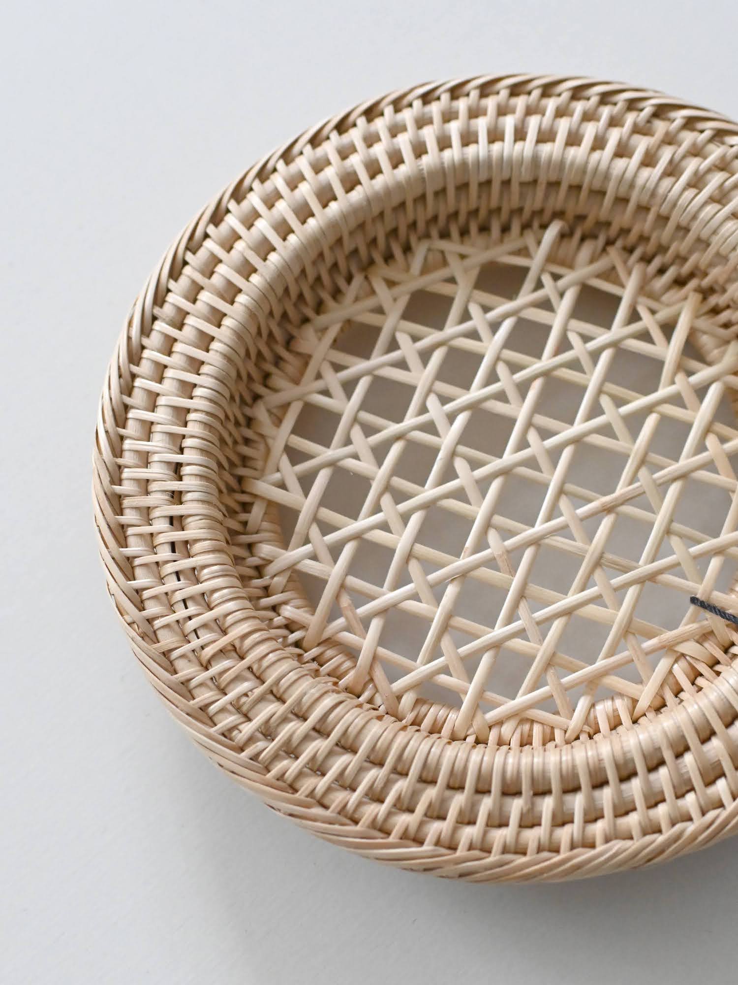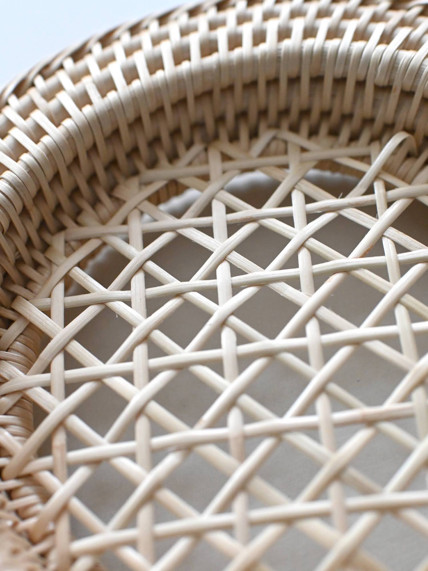 細やかな編み目が美しいラタン(籐)製品は、カンボジアのアンコールワットを抱く都市、シェムリアップ州郊外の自然豊かな村で、ひとつひとつ丁寧に手編みされたものです。この繊細な手工芸の技術は、各家々で代々受け継がれてきたそうです。カンボジアで古くから日用品などに用いられてきた、ルピア種というしなやかで丈夫なラタンの一種で作られています。普段のお手入れではブラシで編み目に沿って掃いたり、乾いた布で拭いてください。水洗いをしていただけますが、極端な湿気はカビなどの原因になりますので、水洗い後はすぐに水気を拭き取り、よく乾燥させてください。